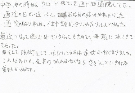 中学1年の時からクローン病で、8週に1回病院へ通院していた。