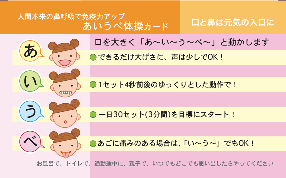 舌の衰えを改善し、頭や顔、噛み合わせも同時によくするのにオススメなのは、今井先生が考案した「あいうべ体操」で、とても簡単に今すぐできます。
