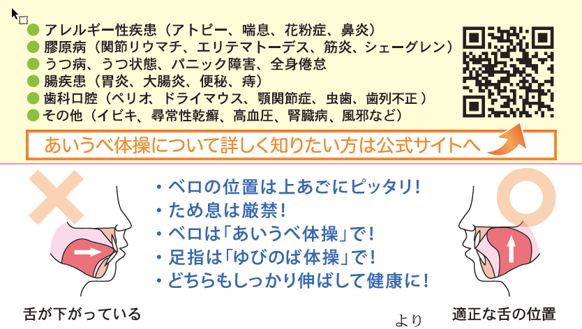 口呼吸になっている人は舌の筋肉が衰えていて、「落ちベロ」(低位舌)になっています。