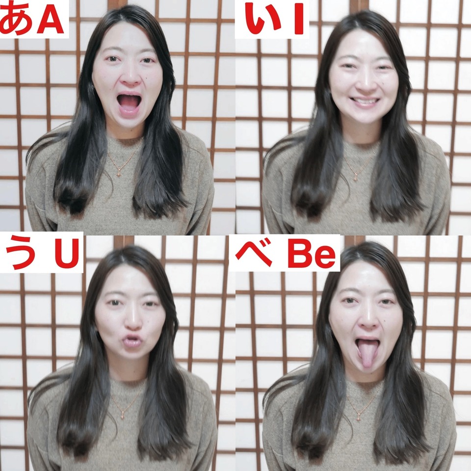 「あ〜」大きく口を開く(1秒)→「い〜」横に広げる(1秒)→「う〜」唇を突き出す(1秒)→「べ〜」舌を顎先まで下に伸ばす(1秒)